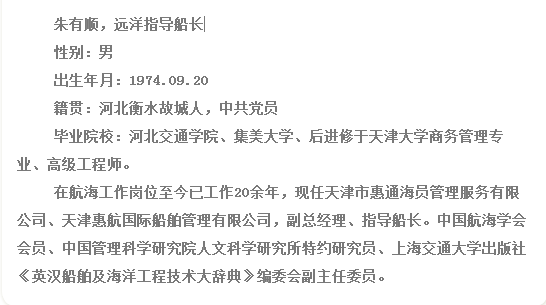 ???朱有順船長(zhǎng)長(zhǎng)期從事航運(yùn)管理和領(lǐng)導(dǎo)一線工作,積累了豐富的航海實(shí)踐工作經(jīng)驗(yàn),熟悉國(guó)際公約和體系管理,科學(xué)管理,在平凡的工作崗位做出了不平凡的業(yè)績(jī),帶領(lǐng)整個(gè)船隊(duì)改革創(chuàng)新,起到領(lǐng)頭作用,從90年代的“學(xué)習(xí)華銅海標(biāo)兵”到2009年的“索馬里抗擊海盜英雄”,先后多次被評(píng)為公司“勞動(dòng)模范”、“優(yōu)秀黨員”和“優(yōu)秀員工”等榮譽(yù)稱(chēng)號(hào)。在2008年多次途經(jīng)索馬里航線,長(zhǎng)期與海盜斗智斗勇,在其過(guò)程中積累和總結(jié)了大量實(shí)際有效的防海盜經(jīng)驗(yàn),并形成了全面成熟有效的方案,在整個(gè)船隊(duì)推廣使用,為船隊(duì)成功抗擊海盜積累了需要寶貴的經(jīng)驗(yàn)。其在途經(jīng)亞丁灣索馬里沿岸抗擊海盜的英勇事跡曾被天津日?qǐng)?bào)社和天津都市報(bào)道等欄目整版報(bào)道,廣為美傳,被譽(yù)為“中國(guó)抗擊海盜第一人”。
