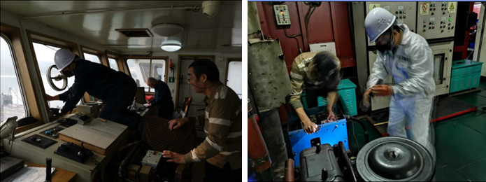 ? ? ? ?7:30到達(dá)碼頭,一行人員沒有休息片刻,馬上投入到緊張有序的維修保養(yǎng)工作中。根據(jù)船長反映的維修項目清單,大家先從駕駛臺入手檢查,薛俊琪雖已年近古稀,但他仍以飽滿的精神狀態(tài),投入到修理工作中來。首先,他把船舶申請修理的駕駛臺與船頭船尾的對講擴(kuò)音設(shè)備修理好,保證駕駛臺的操船指令能夠及時傳達(dá)出去。楊總還親自上陣,用從家里帶來的粘接劑,對駕駛臺防風(fēng)玻璃損壞的膠條進(jìn)行修復(fù)和粘接。根據(jù)輪機(jī)長反映的輔機(jī)時常跳電現(xiàn)象,馮總和薛俊琪兩人配合,對輔機(jī)進(jìn)行分析檢查,在機(jī)器馬達(dá)最不顯眼的地方找到了故障,修理過程中不斷開拓思路,創(chuàng)新維修方法,用最原始的工具將兩臺輔機(jī)全部修理完成。船長邢光耀和輪機(jī)長安全對各位領(lǐng)導(dǎo)的親歷親為非常佩服,表達(dá)感謝之余代表全體船員發(fā)聲:“領(lǐng)導(dǎo)們今日訪船我們真是既欽佩又感動,大家一定會以這種精神為榜樣,積極配合公司為船東做好服務(wù),為公司的發(fā)展貢獻(xiàn)自己的綿薄之力!”?