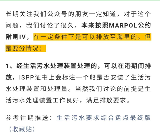 5、船舶在某個國家水域內(nèi)該國對于生活污水有特殊規(guī)定的,遵守該國的規(guī)定(公約中的“較寬”不是更寬松,而是更寬泛即更嚴格);所以每到一個港口前,有必要咨詢代理關于該國港口對于生活污水處理的規(guī)定,以免出現(xiàn)問題。